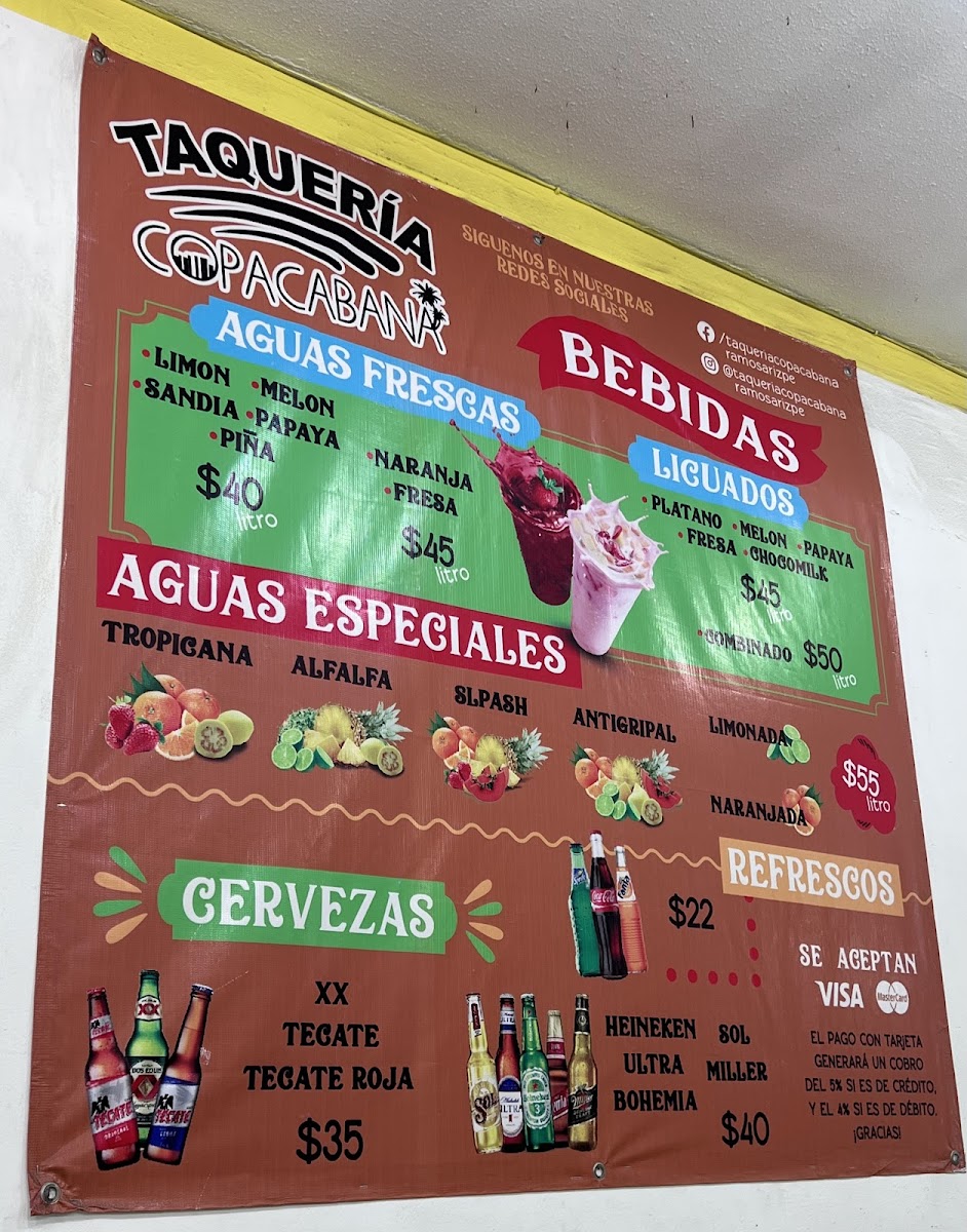 At Taqueria Copacabana, the tacos are the stars. Indulge in the Gringa, featuring five pastor-filled tortillas with melted cheese for MX$230, or savor the Bistec tacos, a hearty plate for just MX$175. For those craving something unique, the Taco Tripa at MX$272 is a must-try.
